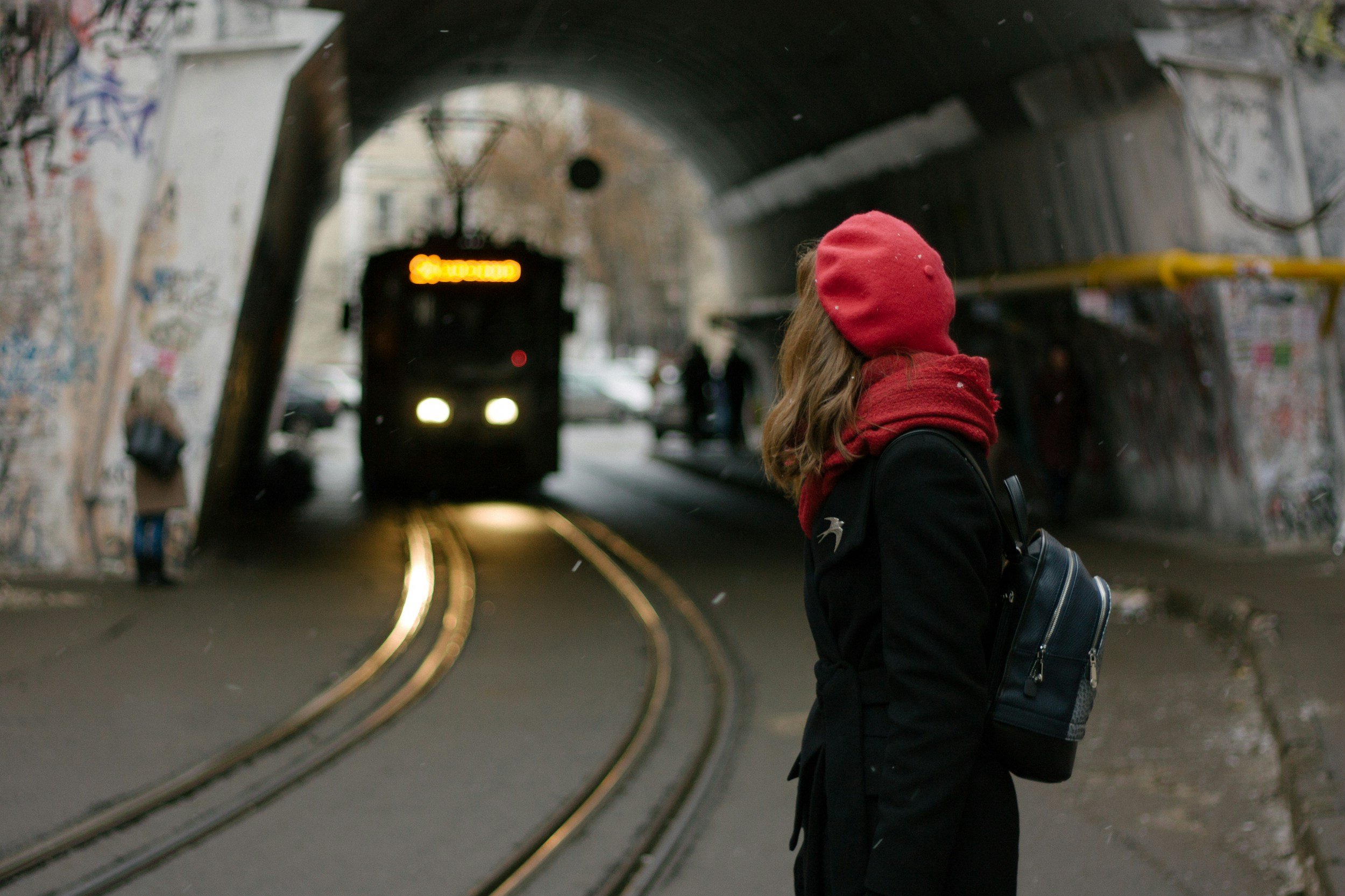 Woman in red beret and scarf waiting for approaching streetcar.
