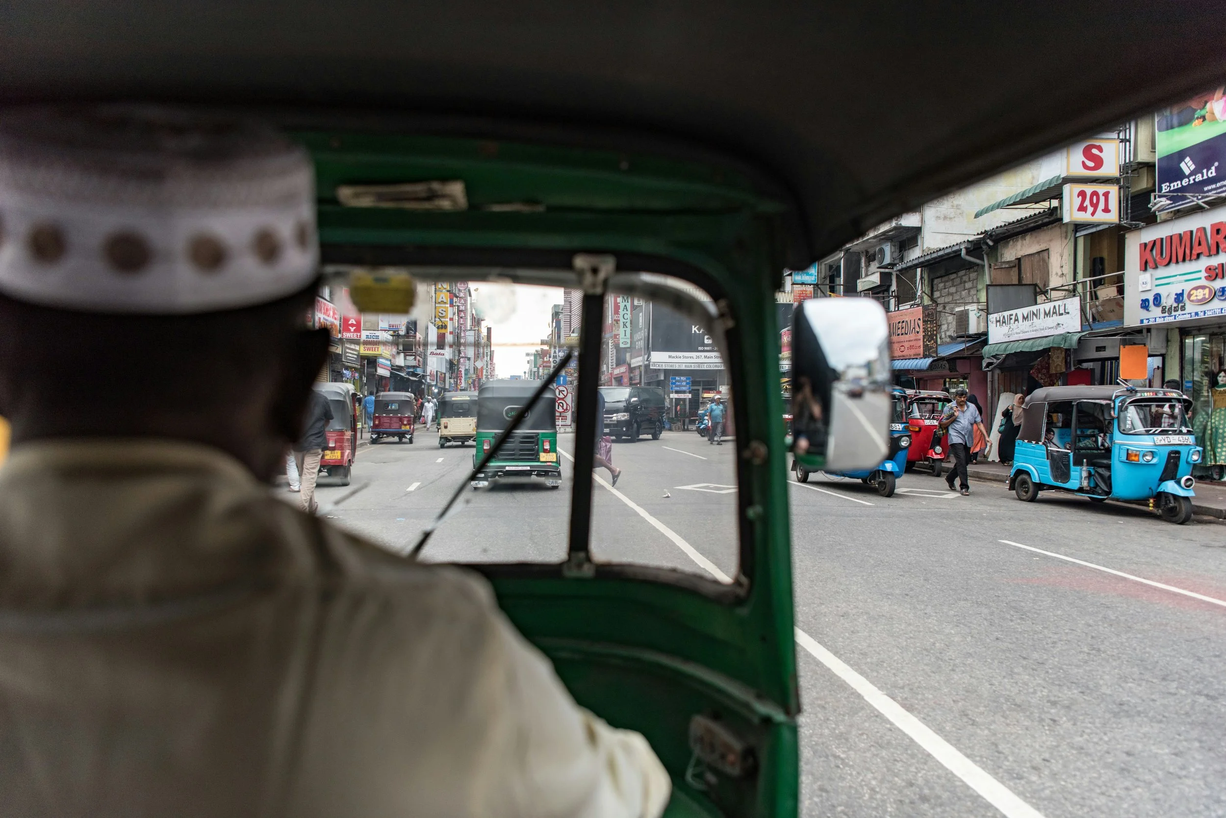 Point of view of someone in the passenger seat of a tuk-tuk, looking over the shoulder of the driver at the street in a foreign city.
